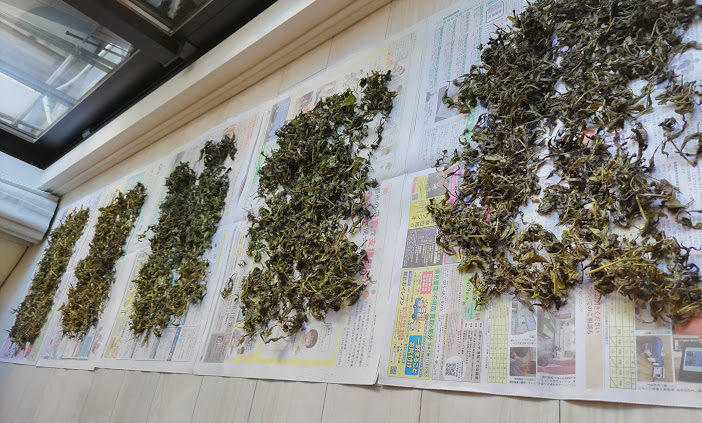 山に自然に生えているお茶の葉を摘んで、茶揉みをして干してお茶を沸かしていただいています。たったこれだけなので、秋までに飲んでしまってなくなります。通常、茶揉みは何人かで炒る人と揉む人で手分けして作業しますが、電子レンジでチンします。