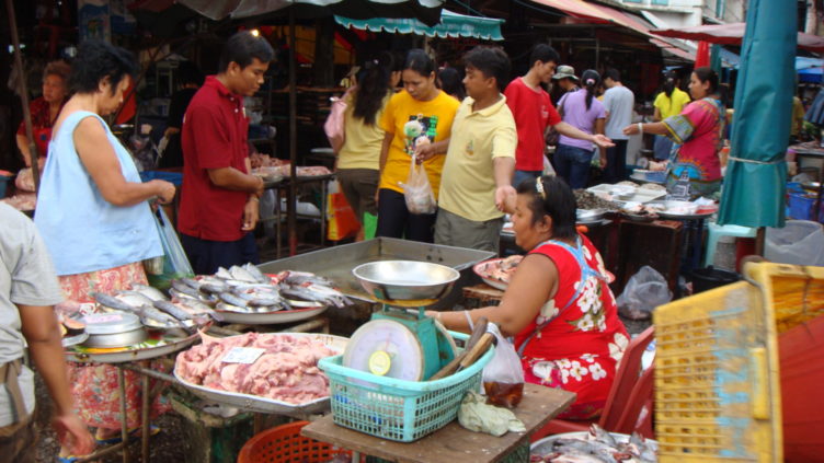私はタイに行くと市場に行くようにしています。それは、タイの庶民の生活が分かるからです。生きている大きめのカエルやナマズにはやや引いてしまいますが、これも庶民の食材ということです。写真のお店は魚屋さんなのかお肉屋さんなのかわかりません。